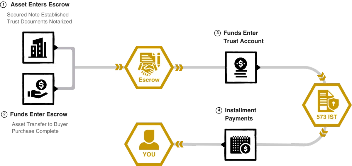 Escrow ensures all sale conditions are satisfied and securely handles the transaction. The trust receives the sale funds and acts as the intermediary, managing the money and issuing payments to the seller according to the terms of the promissory note. This legal structure is crucial for avoiding constructive receipt.