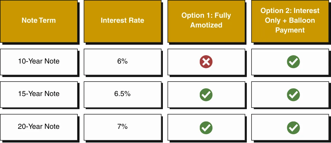 15-Year Note: Fully amortized payments at a 6.5% fixed interest rate or 6.5% Interest-only payments for five years, followed by a balloon payment of the principal at the end.